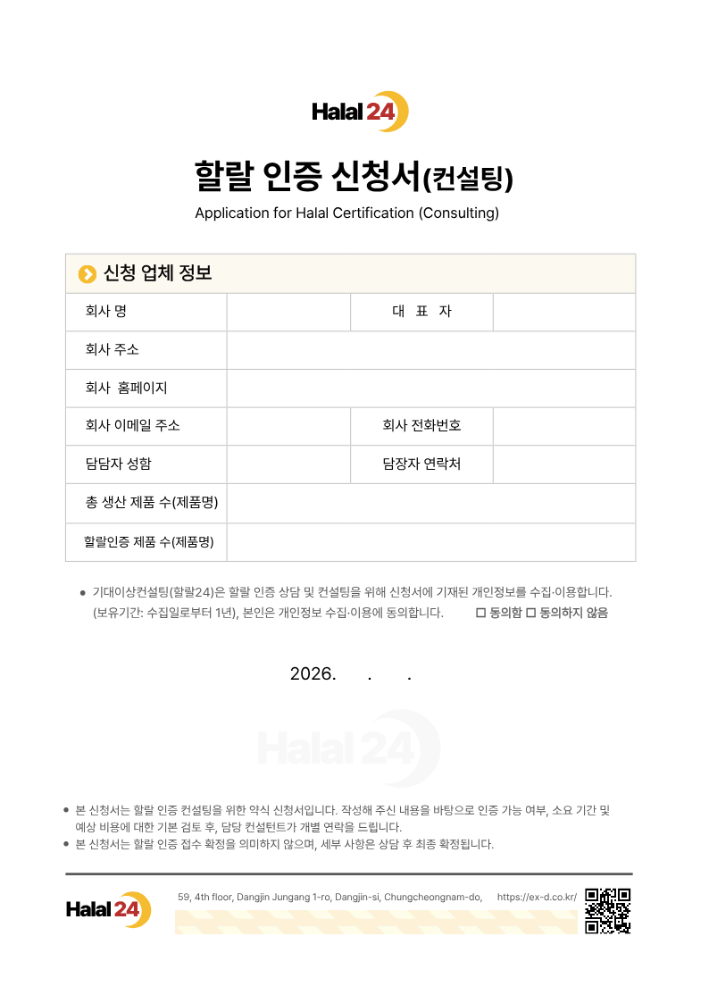 글로벌 할랄인증해외인증 전문 컨설팅 플랫폼 인도네시아 수출을 준비 중이라면,할랄 인증부터 전략적으로 시작해야 합니다. 할랄24는 단순 인증 대행이 아닌,수출·정부지원·해외진출 전략까지 함께 설계하는 전문 컨설팅입니다. 문의 & 상담 바로가기 지원사업 바로가기